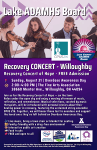 In partnership with the Ohio Department of Mental Health and Addiction Services, Lake County Board of Commissioners, City of Willoughby, The Fine Arts Association, and the Lake County Alcohol, Drug Addiction & Mental Health Services Board.